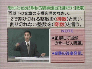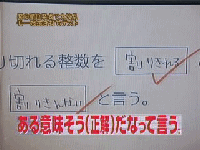 岡村t:ガキさん。 新垣:はい 岡村t:ガキさんの 矢部t:新垣さんね。 岡村t:偶数奇数、なんて書いた のでしょうか。こちら。 佐野t:2で割り切れる整数を「割 り切れる」と言い、割り切れない 整数を「割り切れない」と言う。 岡村t:はい、これ、ある意味そう だなって。 |