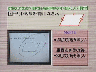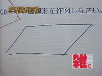 岡村t:↑が完璧な平行四辺形 ですよ。さぁそれでは。吉澤。 吉澤:はぃ。 岡村t:吉澤の平行四辺形見て 見ましょう。こちら。 雑〜ぃ。 雑〜ぃ。雑いよ。 |