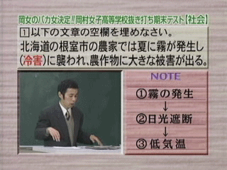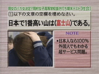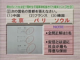 岡村t:外人でも言うよ。 「すし」「天ぷら」「ふじやま」 「芸者」 ふじやま、マウントふ じ 馬鹿! みんな、みんな正 解するとおもったからね。配 点すごく高くしちゃった。 安部:怖いよぉ・・。 |