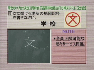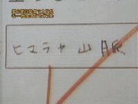 岡村t:こんにちは、安倍さん。 安部:こんにちは。 岡村t:ハイ。安倍の小学校、見てみ ま しょか。こちら。 岡村t:こわっ。なんか怖ッ。 矢部:これは怖い。 岡村t:これ安倍さんは下書きしてか ら書いてますよね。下にも同じの書 いてますよね。ぼんやりと人が。 一回書いてみて「大丈夫やいけ る!」と思って標識の棒の部分をど けてここに書いたわけですね。 |