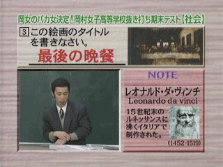 岡村t:噂のコンビが帰って来た。 ツートップの答え。辻加護。加護 は。 加護:ハイィ。なって書いたっけ。 加護はなんて書いたのでしょう か。最後の晩餐を。こちら 佐野t:フランシスコ 岡村t:なんだこら。 |
