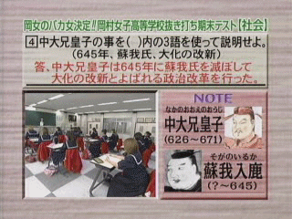 岡村t:ここ見てください。大化 の改新と呼ばれる子供を持っ たってことですよ。ねぇ。すご い ストーリーですね。オリジナルストーリ ー。 (中略) なんじゃこりゃぁ! |