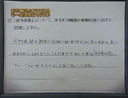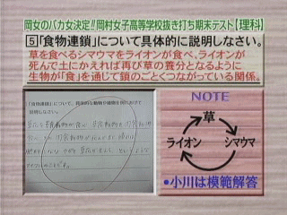 岡村t:さぁ、小川と同じくらい詳しく書いてく れた方がいます。 石川さん。 石川さんの 食物連鎖を見てみましょう。こちら。 佐野t:食物連鎖は簡単に説明すると食物 た ちは育って枯れて育って枯れての繰り返し を一生するわけで、それに必要な「太陽の 光」「水」「土」の三つで成り立っています。 岡村t:ハイ。これ0点です。これこんだけ書 いてくれましたけど0点です。まったく合って ません。食物連鎖かすってません。 石川:ぇ、こういうサイクルですよって。 岡村t:サイクルもクソもないです。これ。食 物連鎖にまったく触れてません。ここに食 物 連鎖って書いてるだけです。 |